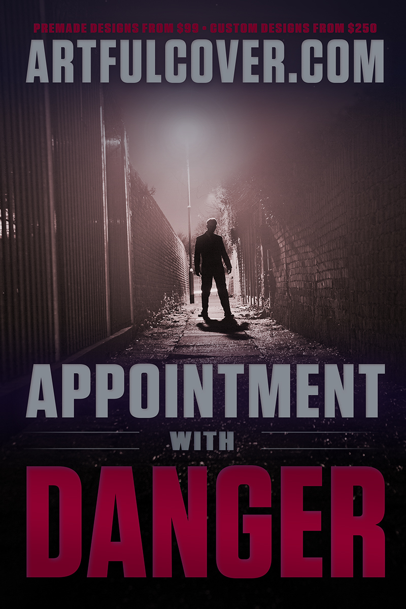 Appointment With Danger is a mystery premade book cover that would also suit suspense and thriller titles in adult and YA categories. The design features a man standing in an imposing manner in an alley between fenced areas, silhouetted under the bright backlit glow of a street light. The title and text are rendered in various weights of blocky sans serif in red and grey tones to coordinate with the image’s colorized tint. The author can opt to tint the image in the color of their choice and replace the text with a similarly tall font.