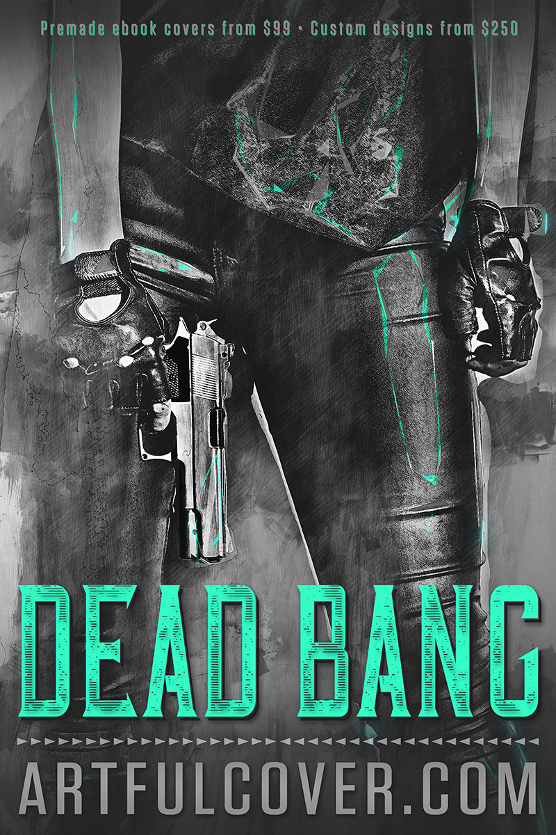 Dead Bang is a thriller premade book cover that would also suit a wide range of suspense and mystery titles in adult and YA categories, as well as select urban fantasy and women’s fiction with crime and action themes. The design, illustrated in dark low-saturation style with highlights of vivid teal, features a woman in black leather and driving gloves holding a gun before a smoky background. The title is rendered in a teal distressed neo-western style, with other text in clean modern san serif accented with an arrow divider element.