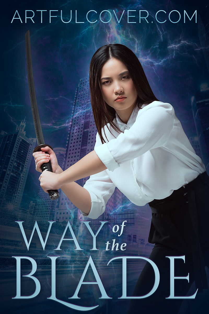 Way of the Blade is a UF premade book cover that could also be suitable for paranormal fantasy, contemporary fantasy, or modern fantasy retellings. A young Japanese woman takes a battle stance with a katana against a night cityscape accented by mystical lightning and colored smoke with modern fantasy titling. This premade book cover design includes existing text as shown. Text features can be modified in type color, font, and positioning or more features may be added, though these changes may require additional design costs.